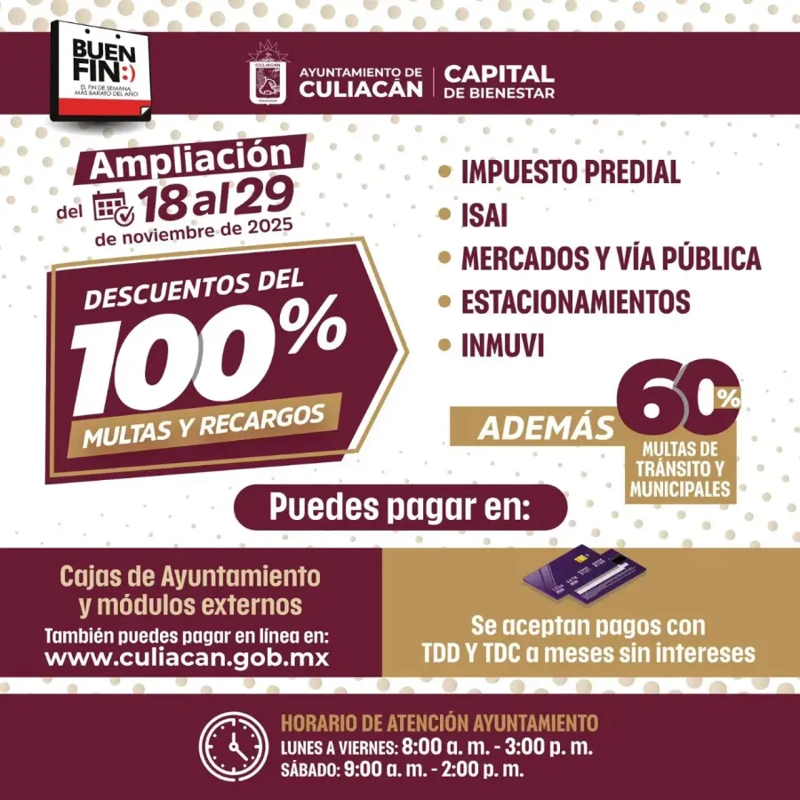 Culiacán, Sinaloa; a 28 de noviembre de 2025.– El Ayuntamiento de Culiacán informa a la ciudadanía que los descuentos del Buen Fin 2025 continúan disponibles únicamente hoy y hasta mañana 29 de noviembre, por lo que se invita a contribuyentes a aprovechar esta recta final para regularizar sus adeudos con importantes beneficios.